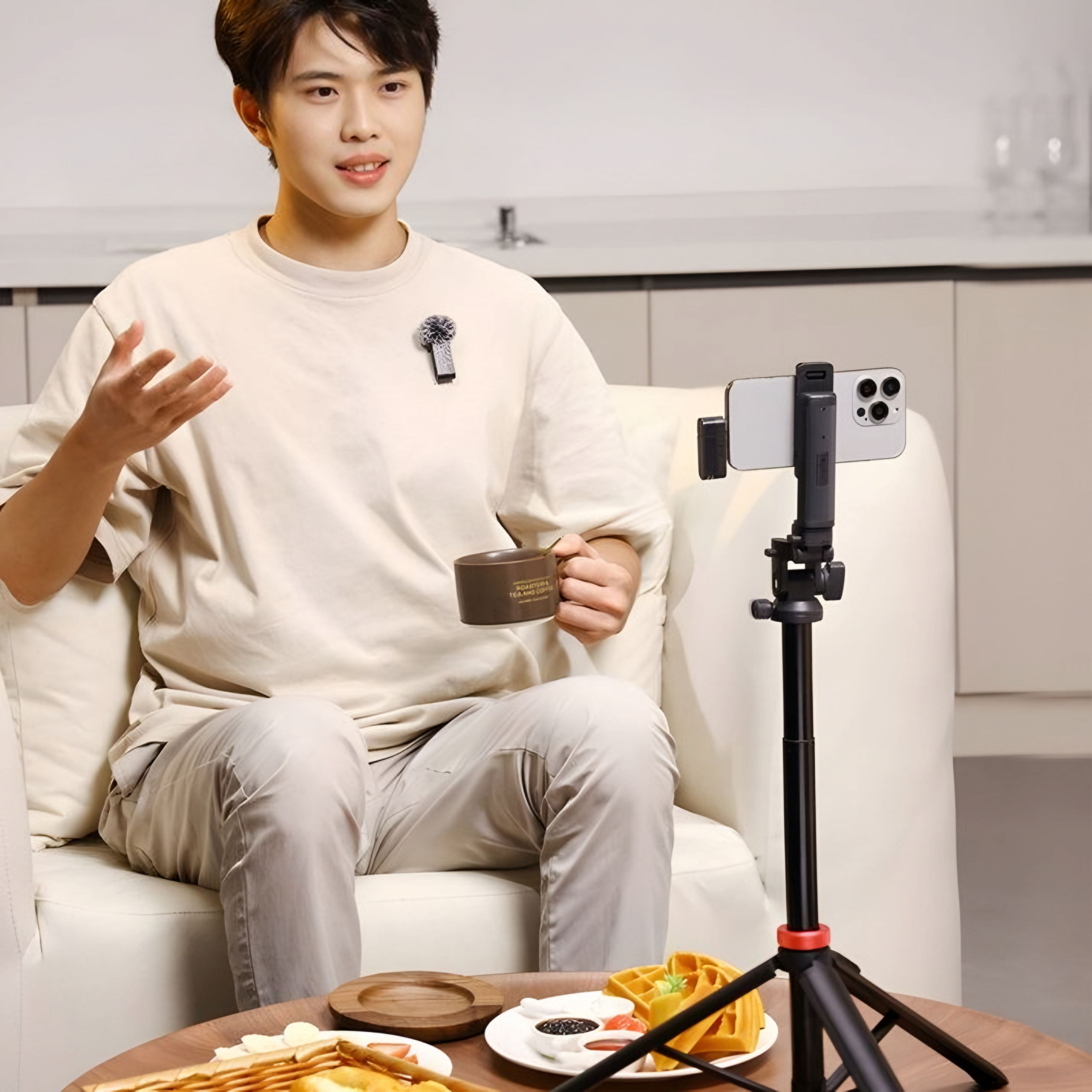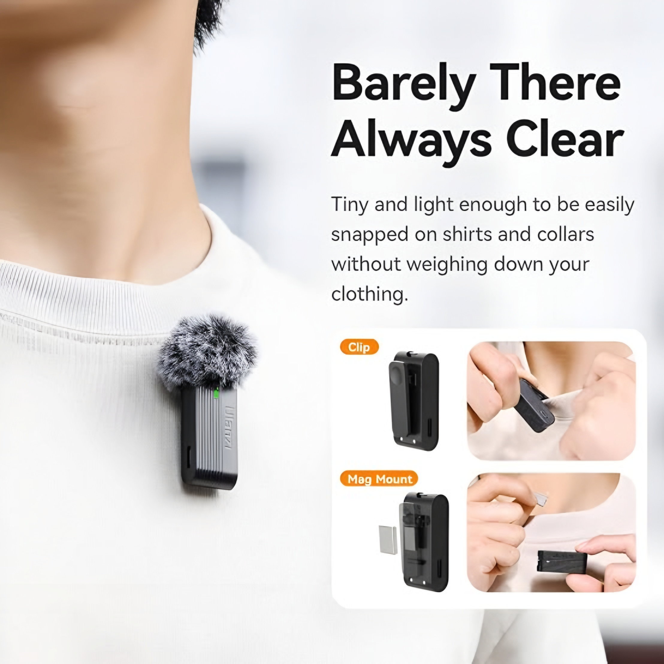 The Ulanzi A100 Wireless Lavalier Microphone is exceptionally lightweight and portable thanks to its thin, compact shape. Weighing only 9.6g (0.021lb) won’t weigh you down on long shoots or recordings.